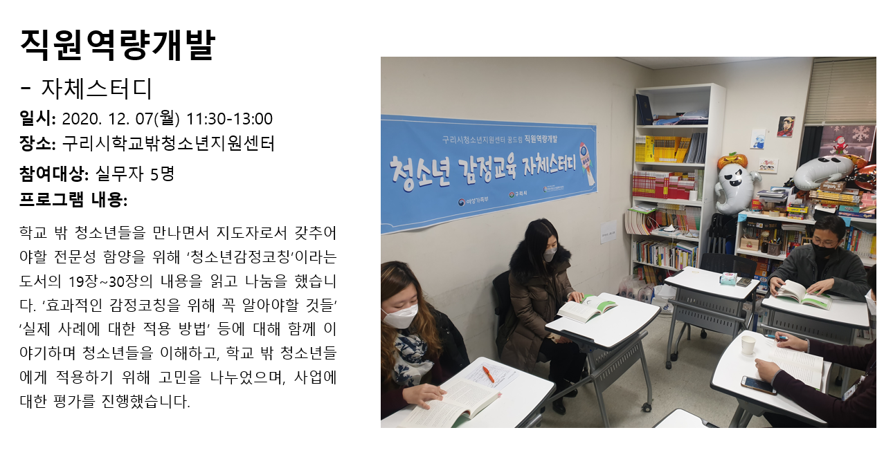 청소년상담복지센터 2020년 12월 직원역량개발 - 자체스터디 작성자 관리자 등록일자 2021년 1월 7일 9시 28분 11초 조회 356 1609979291_photo_table.png [ Size : 733.24KB , Down : 171 ] 미리보기 다운로드 목록보기