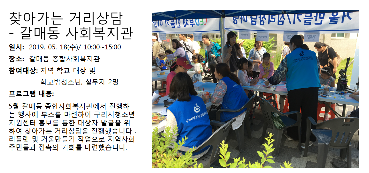 청소년상담복지센터 2019년 5월 찾아가는거리상담 - 갈매동 사회복지관 작성자 관리자 등록일자 2019년 6월 4일 14시 10분 18초 조회 297 1559625018_photo_table.png [ Size : 1003.25KB , Down : 118 ] 미리보기 다운로드 목록보기