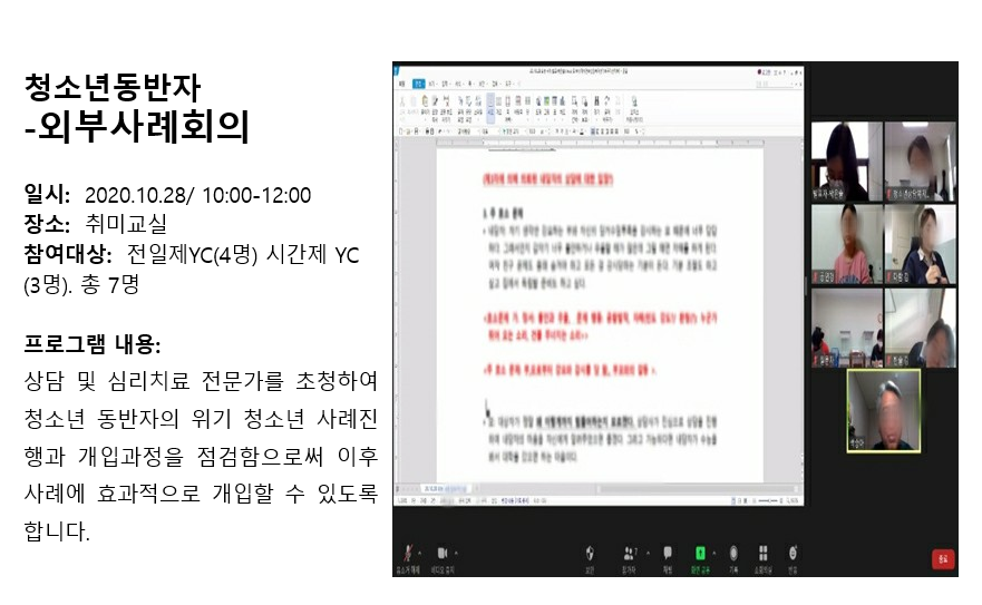 청소년상담복지센터 2020년 10월 YC 외부사례회의 작성자 관리자 등록일자 2020년 11월 4일 11시 6분 20초 조회 340 1604455580_photo_table.png [ Size : 267.09KB , Down : 135 ] 미리보기 다운로드 목록보기