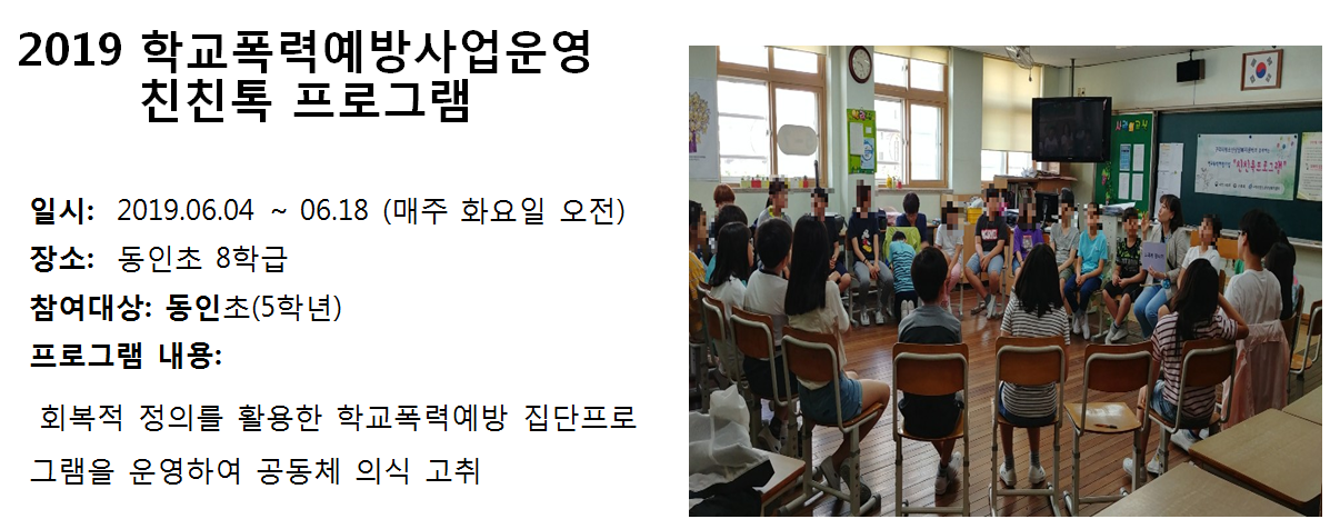 청소년상담복지센터 2019년 6월 학교폭력예방사업운영 친친톡프로그램 (동인초) 작성자 관리자 등록일자 2019년 7월 5일 17시 33분 27초 조회 322 1562315607_photo_table.png [ Size : 596.2KB , Down : 115 ] 미리보기 다운로드 목록보기