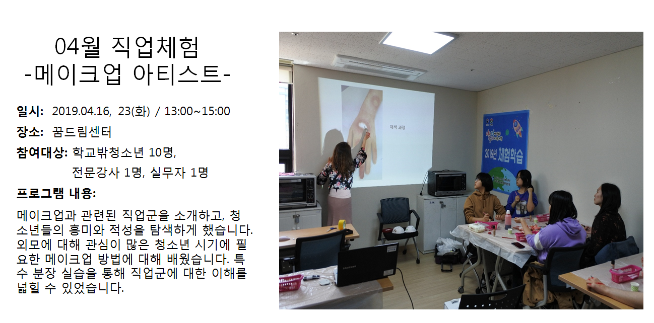 청소년상담복지센터 2019년 4월 직업체험 - 메이크업아티스트 작성자 관리자 등록일자 2019년 5월 2일 13시 46분 23초 조회 353 1556772383_photo_table.png [ Size : 827.57KB , Down : 114 ] 미리보기 다운로드 목록보기