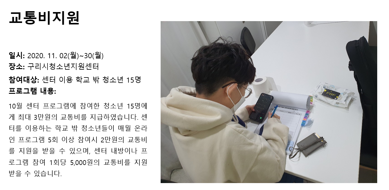 청소년상담복지센터 2020년 11월 교통비지원 작성자 관리자 등록일자 2020년 12월 4일 11시 14분 21초 조회 309 1607048061_photo_table.png [ Size : 574.92KB , Down : 126 ] 미리보기 다운로드 목록보기
