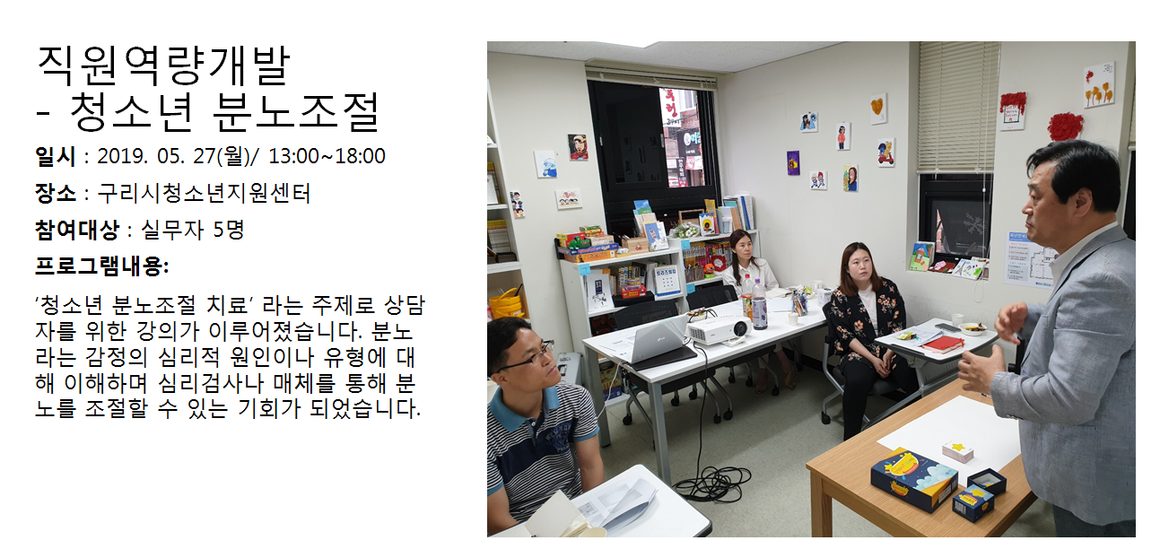 청소년상담복지센터 2019년 5월 직원역량개발 - 청소년분노조절 작성자 관리자 등록일자 2019년 6월 4일 14시 7분 26초 조회 313 1559624846_photo_table.png [ Size : 836.4KB , Down : 135 ] 미리보기 다운로드 목록보기