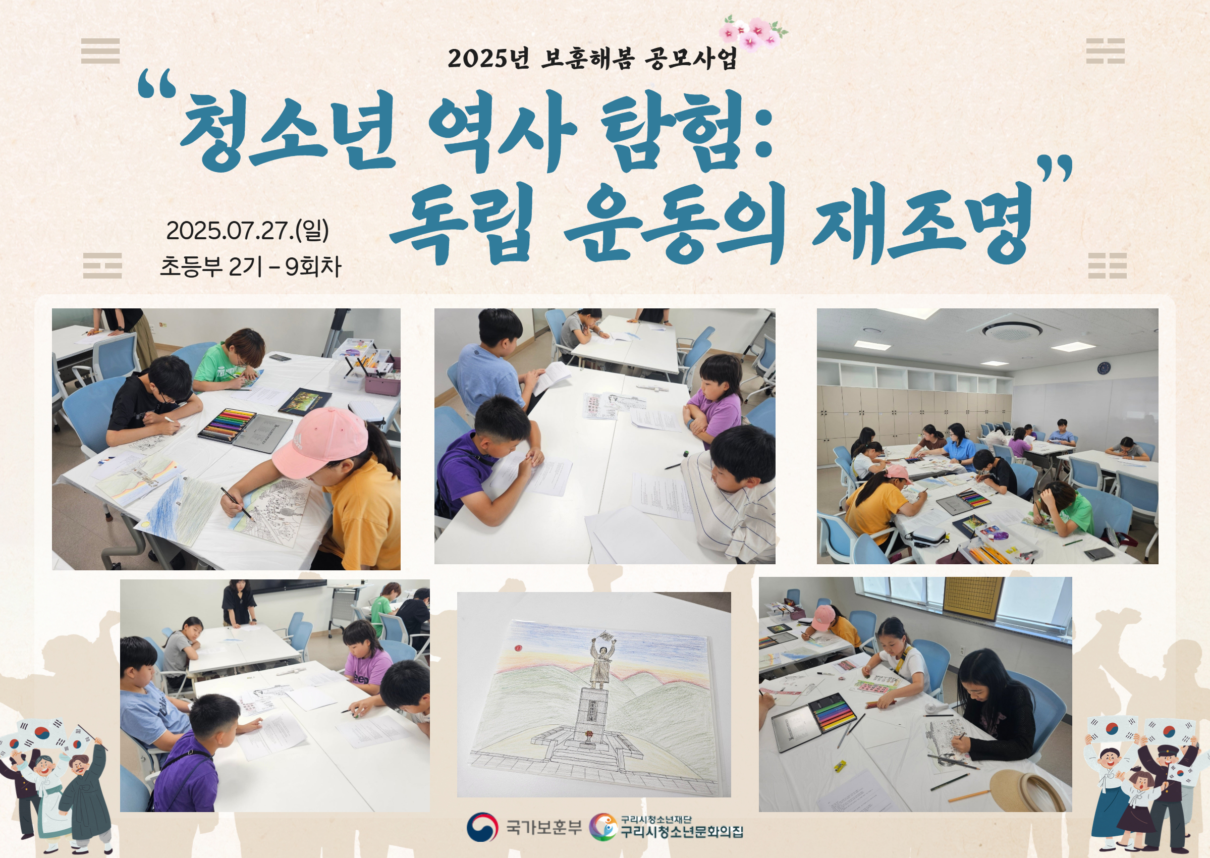 청소년문화의집 보훈부 공모사업 '청소년 역사탐험' 초등부 2기 - 9회차(2025.07.27) 작성자 김윤지 등록일자 2025년 7월 27일 12시 55분 20초 조회 69 국가보훈부 공모사업 '청소년 역사탐험: 독립 운동의 재조명'초등부 2기 9회차 - 일러스트 작업Ⅱ(10시~12시 총 2시간) 활동기록(공모사업) (3).jpg [ Size : 3.28MB , Down : 37 ] 미리보기 다운로드 목록보기