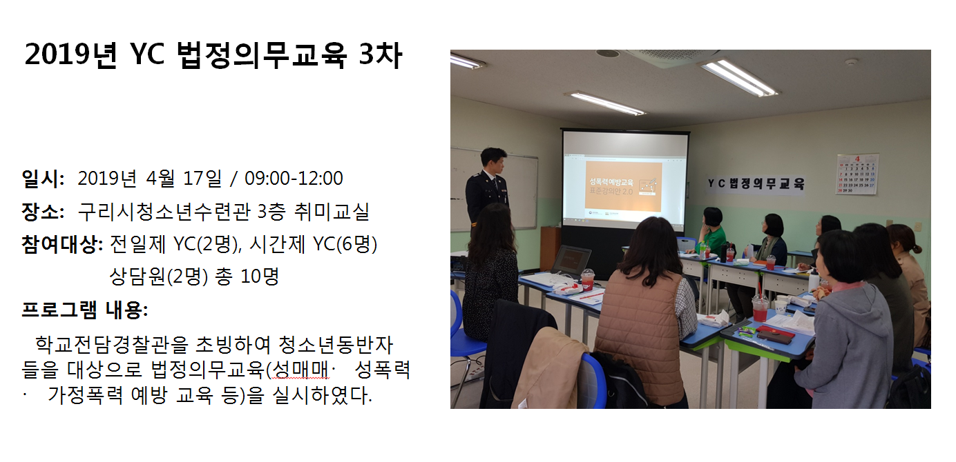 청소년상담복지센터 2019년 YC 법정의무교육 3차 작성자 관리자 등록일자 2019년 4월 30일 14시 51분 25초 조회 354 1556603485_photo_table.png [ Size : 686.61KB , Down : 113 ] 미리보기 다운로드 목록보기
