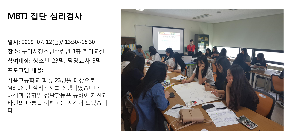청소년상담복지센터 2019년 7월 MBTI 집단 심리검사 작성자 관리자 등록일자 2019년 8월 5일 17시 16분 27초 조회 377 1564992987_photo_table.png [ Size : 586.43KB , Down : 112 ] 미리보기 다운로드 목록보기
