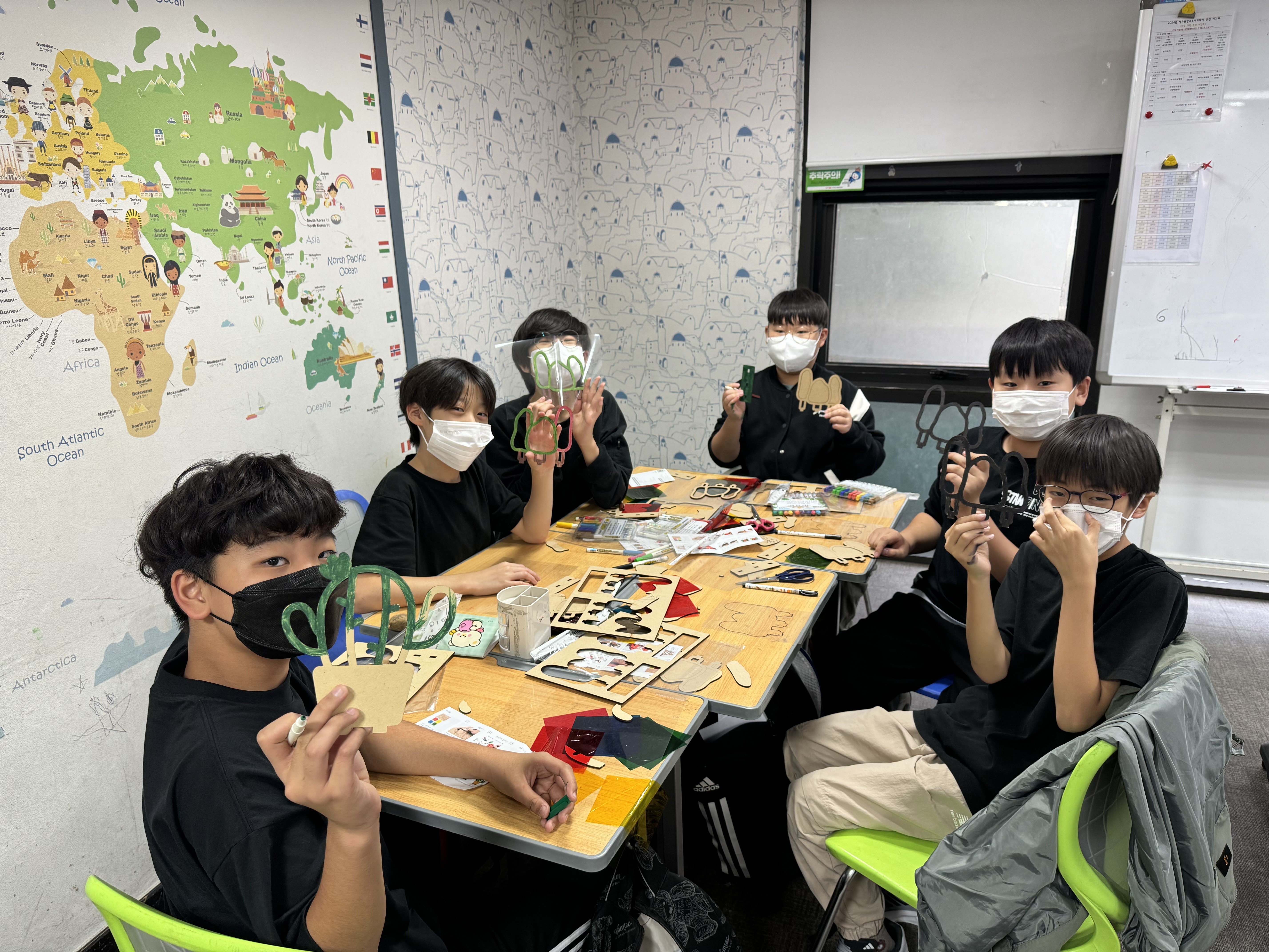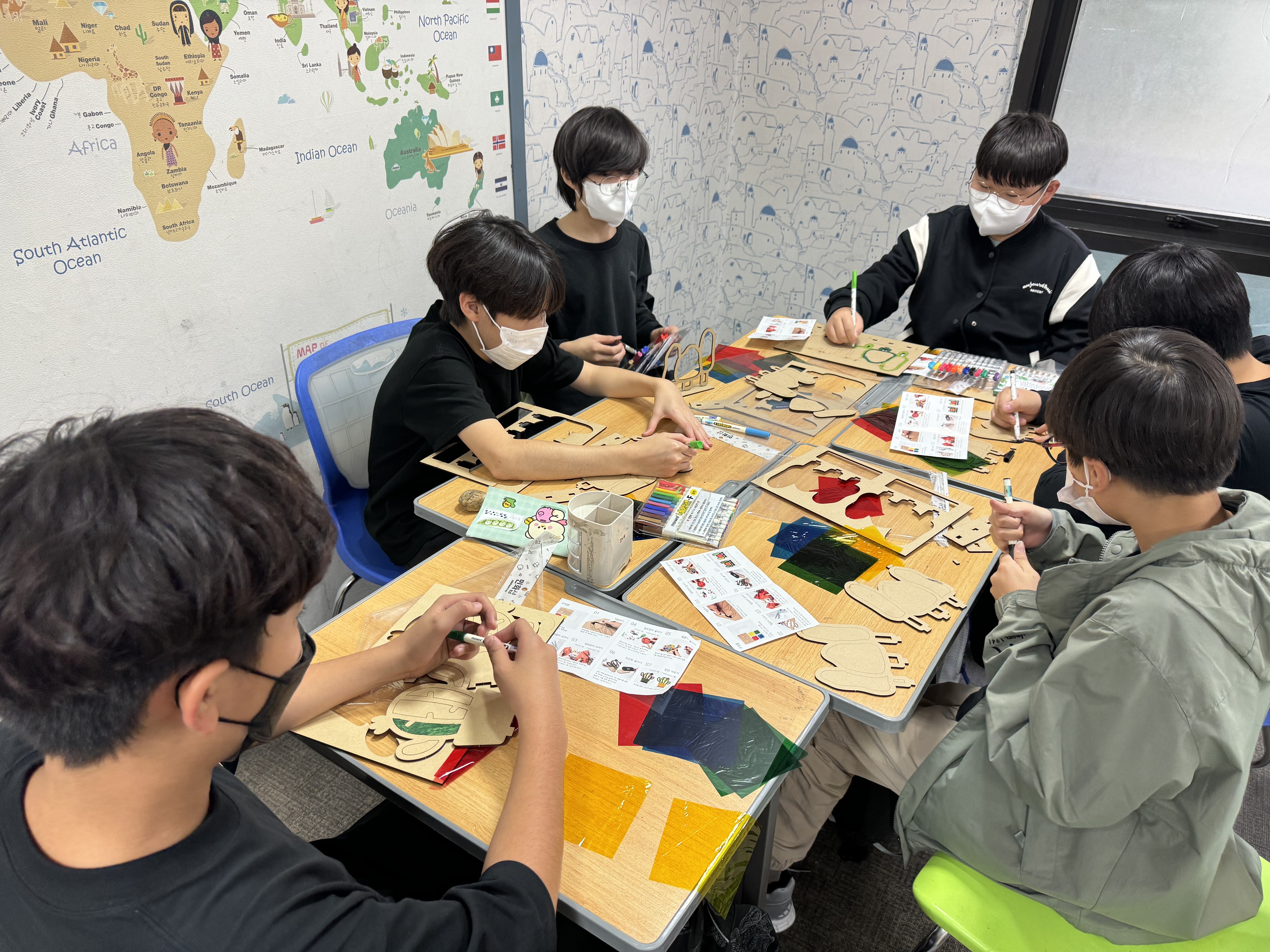 우리 늘푸름방과후아카데미 친구들 재료를 하나씩 확인해보고 색상 셀로판지를 하나씩 조명에 비추며 서로의 얼굴을 바라보며 즐겁게 웃네요.