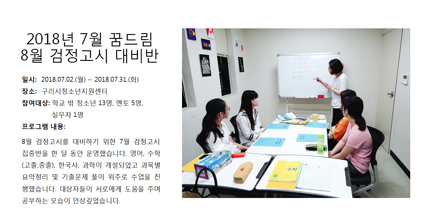 청소년상담복지센터 2018년 7월 꿈드림 8월검정고시 대비반 작성자 관리자 등록일자 2018년 8월 7일 10시 13분 48초 조회 346 1533604428_photo_table.png [ Size : 809.89KB , Down : 116 ] 미리보기 다운로드 목록보기