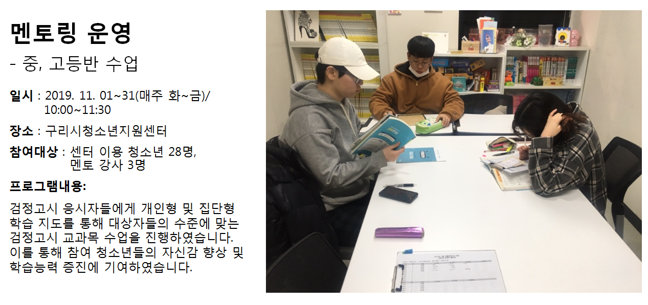 청소년상담복지센터 2019년 11월 멘토링 운영 - 중,고등반 수업 작성자 관리자 등록일자 2019년 12월 4일 11시 48분 47초 조회 289 1575427727_photo_table.png [ Size : 733.9KB , Down : 104 ] 미리보기 다운로드 목록보기