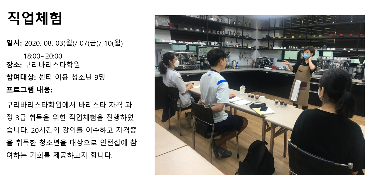 청소년상담복지센터 2020년 8월 직업체험 작성자 관리자 등록일자 2020년 9월 3일 11시 18분 35초 조회 350 1599099515_photo_table.png [ Size : 846.89KB , Down : 122 ] 미리보기 다운로드 목록보기