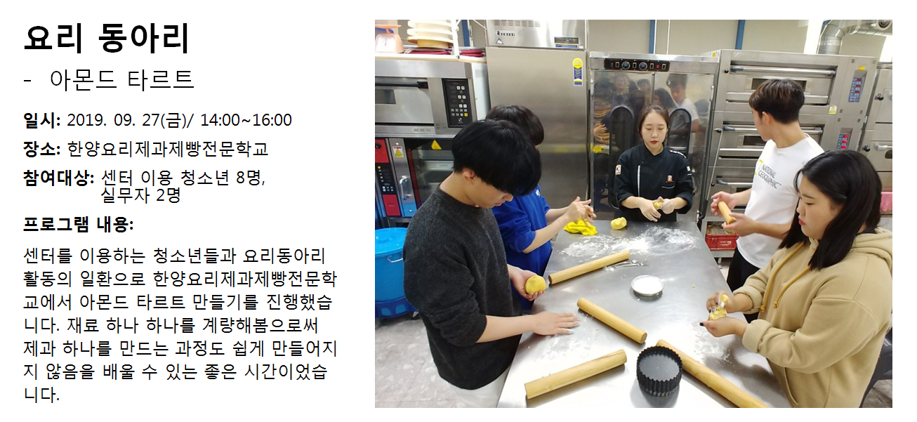 청소년상담복지센터 2019년 9월 요리동아리 (아몬드타르트) 작성자 관리자 등록일자 2019년 10월 2일 17시 1분 8초 조회 349 1570003268_photo_table.png [ Size : 952.44KB , Down : 115 ] 미리보기 다운로드 목록보기