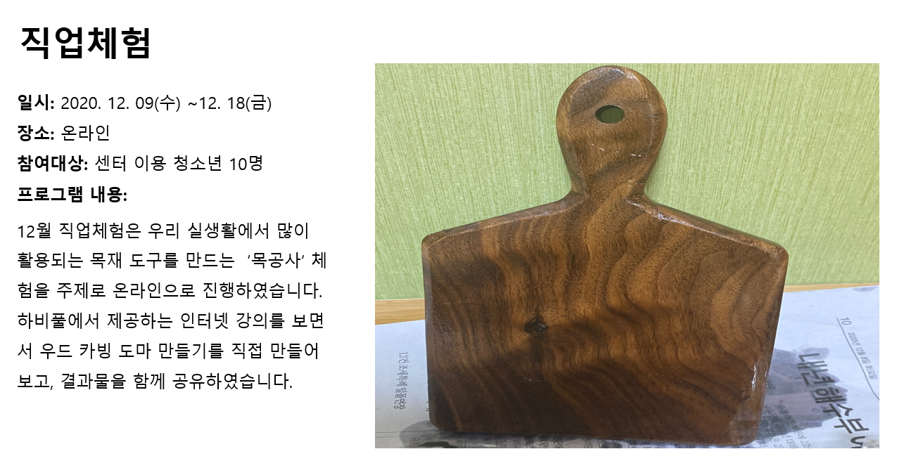 청소년상담복지센터 2020년 12월 직업체험 작성자 관리자 등록일자 2021년 1월 7일 9시 25분 49초 조회 324 1609979149_photo_table.png [ Size : 942.58KB , Down : 148 ] 미리보기 다운로드 목록보기