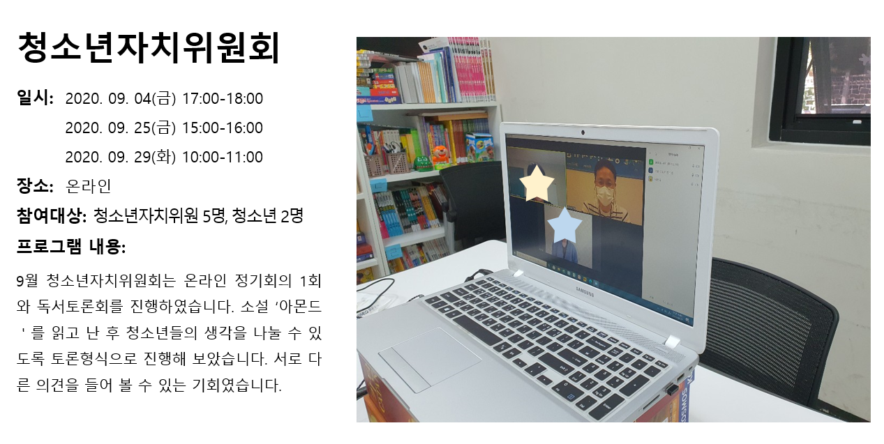 청소년상담복지센터 2020년 9월 청소년자치위원회 작성자 관리자 등록일자 2020년 10월 7일 14시 51분 3초 조회 313 1602049863_photo_table.png [ Size : 737.91KB , Down : 118 ] 미리보기 다운로드 목록보기