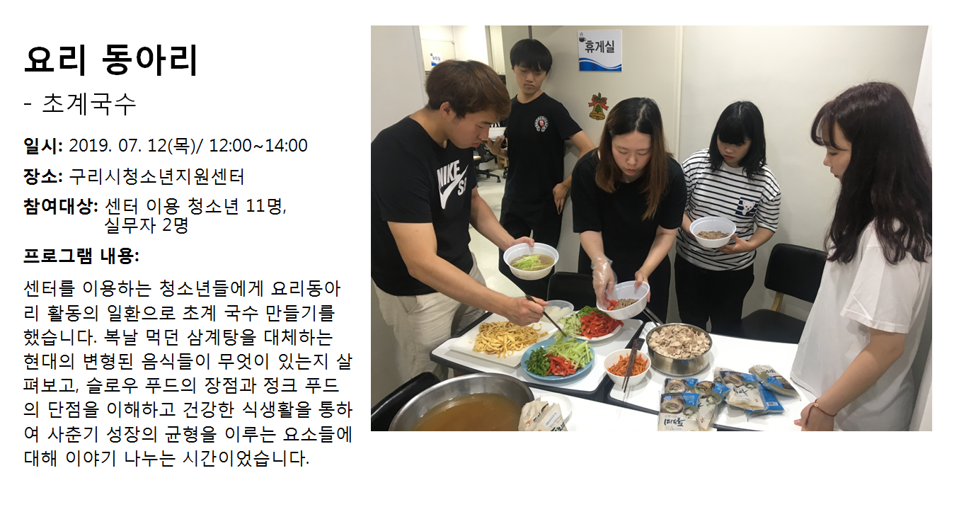 청소년상담복지센터 2019년 7월 요리동아리 - 초계국수 작성자 관리자 등록일자 2019년 8월 1일 14시 50분 45초 조회 298 1564638645_photo_table.png [ Size : 929.26KB , Down : 128 ] 미리보기 다운로드 목록보기