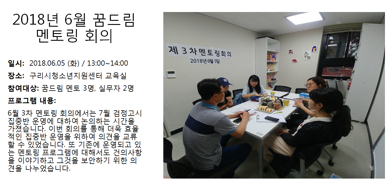 청소년상담복지센터 2018년 6월 꿈드림 멘토링 회의 작성자 관리자 등록일자 2018년 7월 3일 14시 1분 5초 조회 537 1530594065_photo_table.png [ Size : 763.84KB , Down : 118 ] 미리보기 다운로드 목록보기