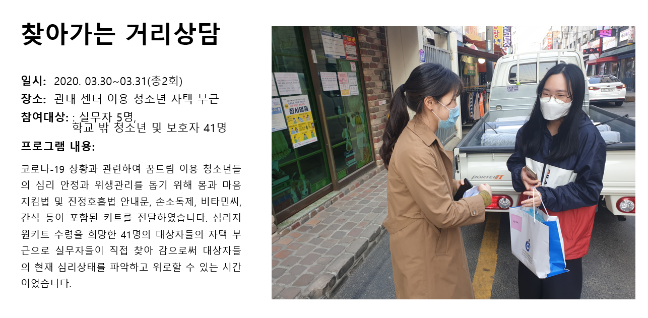 청소년상담복지센터 2020년 3월 찾아가는 거리상담 작성자 관리자 등록일자 2020년 4월 6일 11시 24분 24초 조회 271 1586139864_photo_table.png [ Size : 924.94KB , Down : 102 ] 미리보기 다운로드 목록보기
