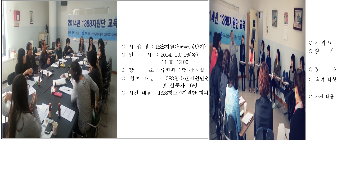 청소년상담복지센터 2014년 1388지원단회의 작성자 관리자 등록일자 2014년 12월 31일 10시 29분 13초 조회 578 1419989353_photo_table.jpg [ Size : 234.56KB , Down : 106 ] 미리보기 다운로드 목록보기