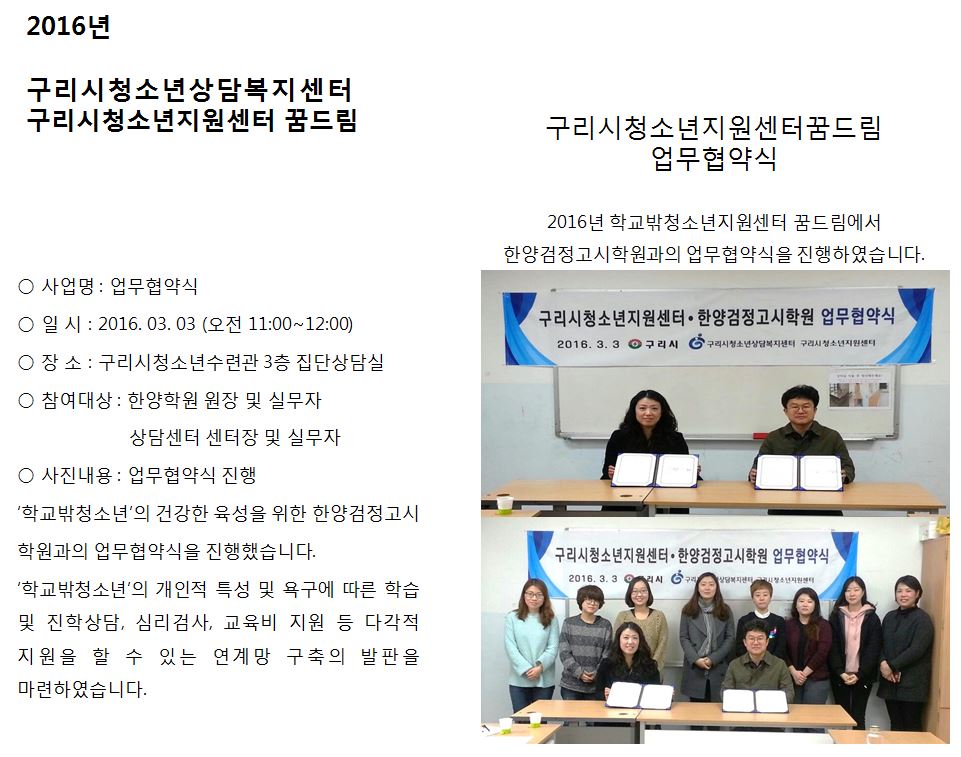 청소년상담복지센터 [꿈드림] 한양검정고시 업무협약식 작성자 관리자 등록일자 2016년 3월 9일 11시 26분 57초 조회 532 1457490417_photo_table.jpg [ Size : 130.14KB , Down : 108 ] 미리보기 다운로드 목록보기