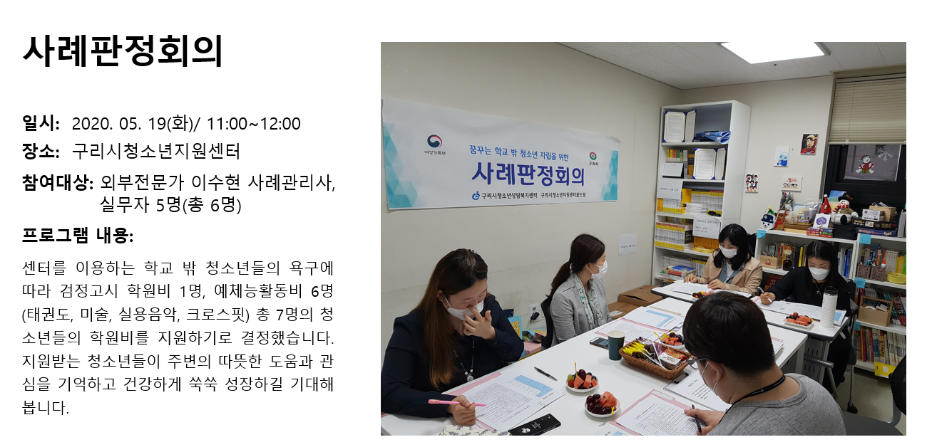 청소년상담복지센터 2020년 5월 사례판정회의 작성자 관리자 등록일자 2020년 6월 5일 10시 4분 9초 조회 301 1591319049_photo_table.png [ Size : 782.48KB , Down : 136 ] 미리보기 다운로드 목록보기