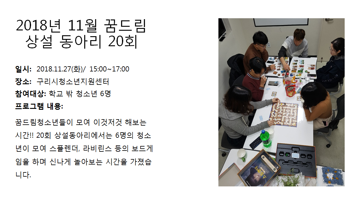 청소년상담복지센터 2018년 11월 상설동아리 20회 작성자 관리자 등록일자 2018년 12월 7일 13시 10분 27초 조회 304 1544155827_photo_table.png [ Size : 512.68KB , Down : 107 ] 미리보기 다운로드 목록보기
