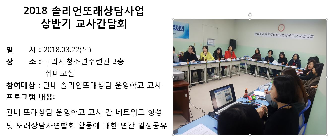 청소년상담복지센터 2018년 솔리언또래상담사업 상반기 교사 간담회 작성자 관리자 등록일자 2018년 3월 28일 13시 58분 30초 조회 364 1522213110_photo_table.jpg [ Size : 106.4KB , Down : 106 ] 미리보기 다운로드 목록보기