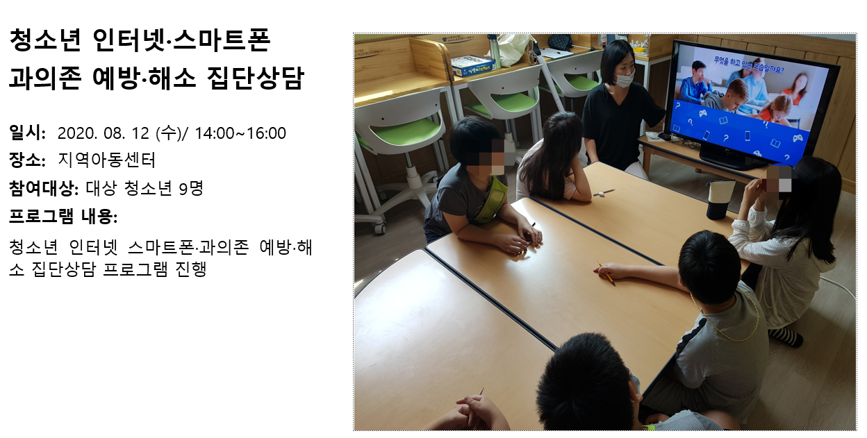 청소년상담복지센터 2020년 8월 청소년 인터넷.스마트폰 과의존 예방해소 집단상담 작성자 관리자 등록일자 2020년 9월 3일 11시 18분 21초 조회 331 1599099501_photo_table.png [ Size : 841.88KB , Down : 117 ] 미리보기 다운로드 목록보기