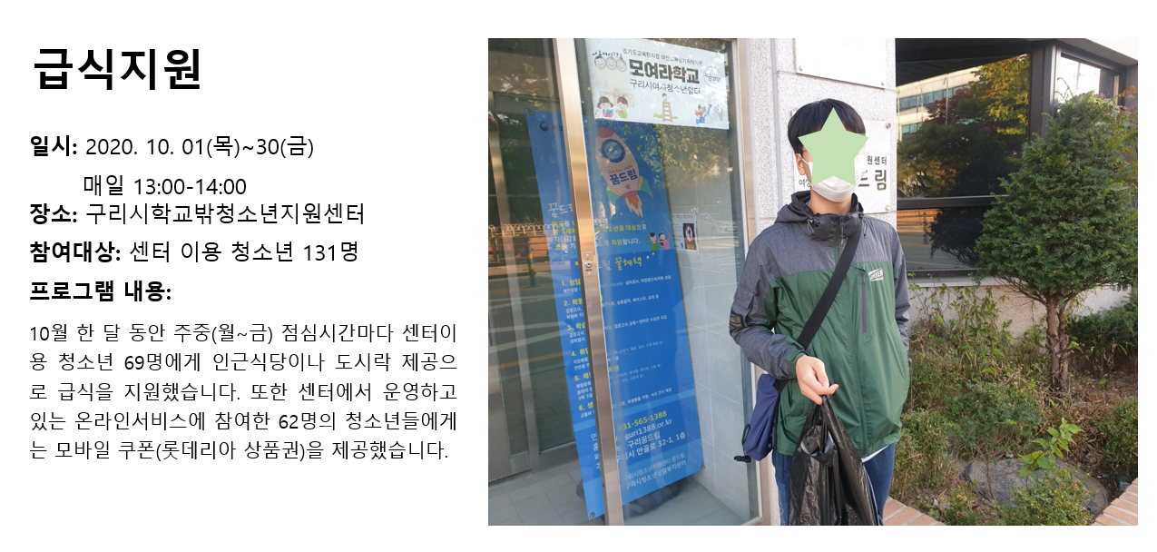 청소년상담복지센터 2020년 10월 급식지원 작성자 관리자 등록일자 2020년 11월 10일 11시 53분 15초 조회 377 1604976795_photo_table.png [ Size : 958.39KB , Down : 142 ] 미리보기 다운로드 목록보기