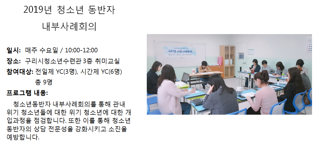 청소년상담복지센터 2019년 4월 YC 내부사례회의 작성자 관리자 등록일자 2019년 4월 11일 15시 23분 51초 조회 291 1554963831_photo_table.png [ Size : 402.96KB , Down : 119 ] 미리보기 다운로드 목록보기