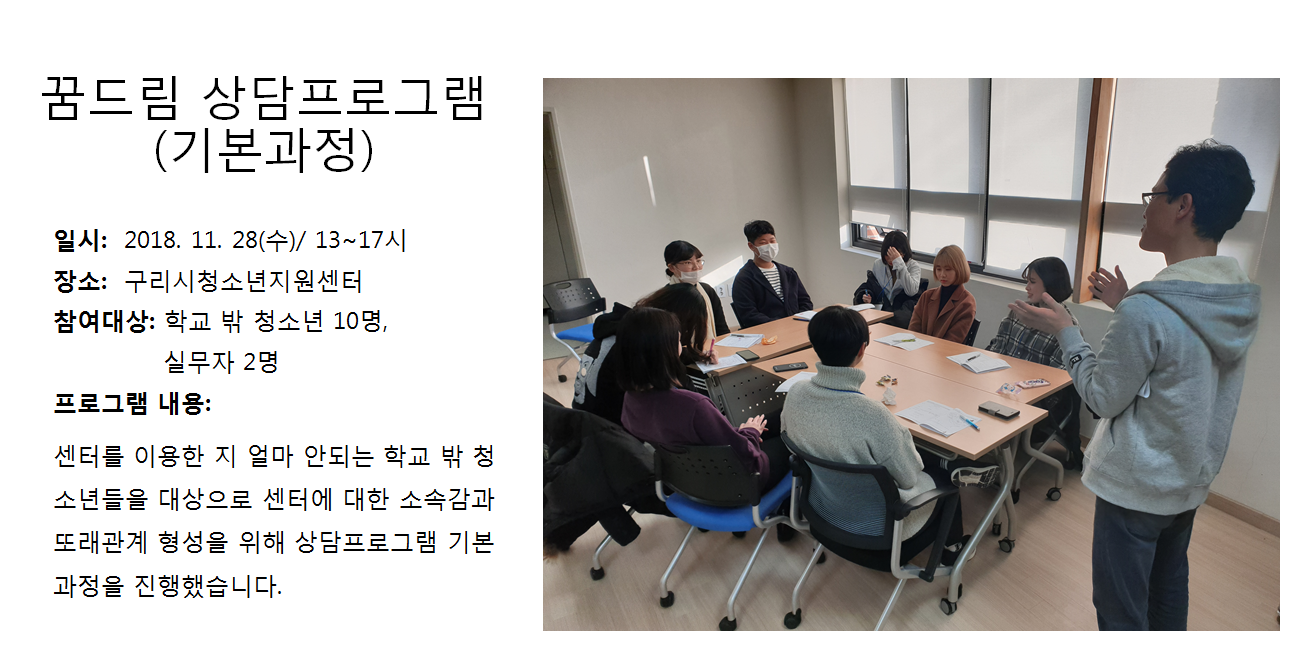 청소년상담복지센터 2018년 11월 상담프로그램 (기본과정) 작성자 관리자 등록일자 2018년 12월 7일 13시 9분 27초 조회 336 1544155767_photo_table.png [ Size : 854.55KB , Down : 119 ] 미리보기 다운로드 목록보기