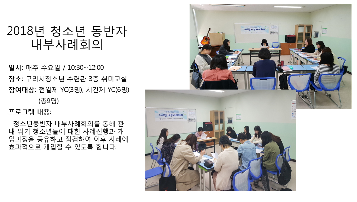 청소년상담복지센터 2018년 YC 5월 내부사례회의 작성자 관리자 등록일자 2018년 6월 5일 18시 21분 1초 조회 387 1528190625_photo_table.png [ Size : 784.96KB , Down : 117 ] 미리보기 다운로드 목록보기