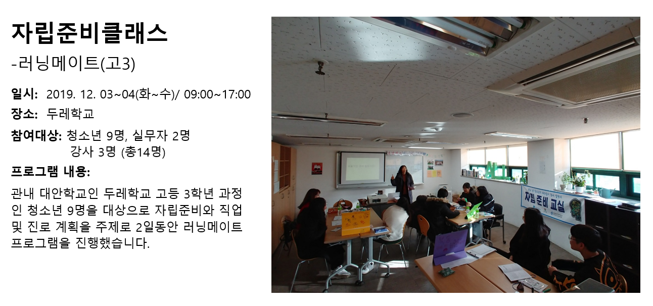 청소년상담복지센터 2019년 12월 자립준비클래스 - 러닝메이트(고3) 작성자 관리자 등록일자 2020년 1월 6일 14시 29분 6초 조회 348 1578288546_photo_table.png [ Size : 804.07KB , Down : 116 ] 미리보기 다운로드 목록보기