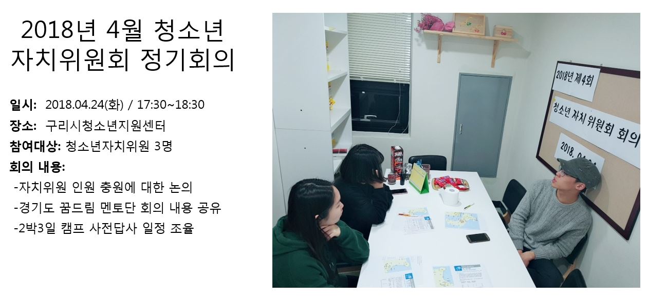 청소년상담복지센터 2018년 4월 청소년자치위원회 정기회의 작성자 관리자 등록일자 2018년 5월 2일 18시 7분 52초 조회 351 1525252072_photo_table.jpg [ Size : 100.41KB , Down : 101 ] 미리보기 다운로드 목록보기