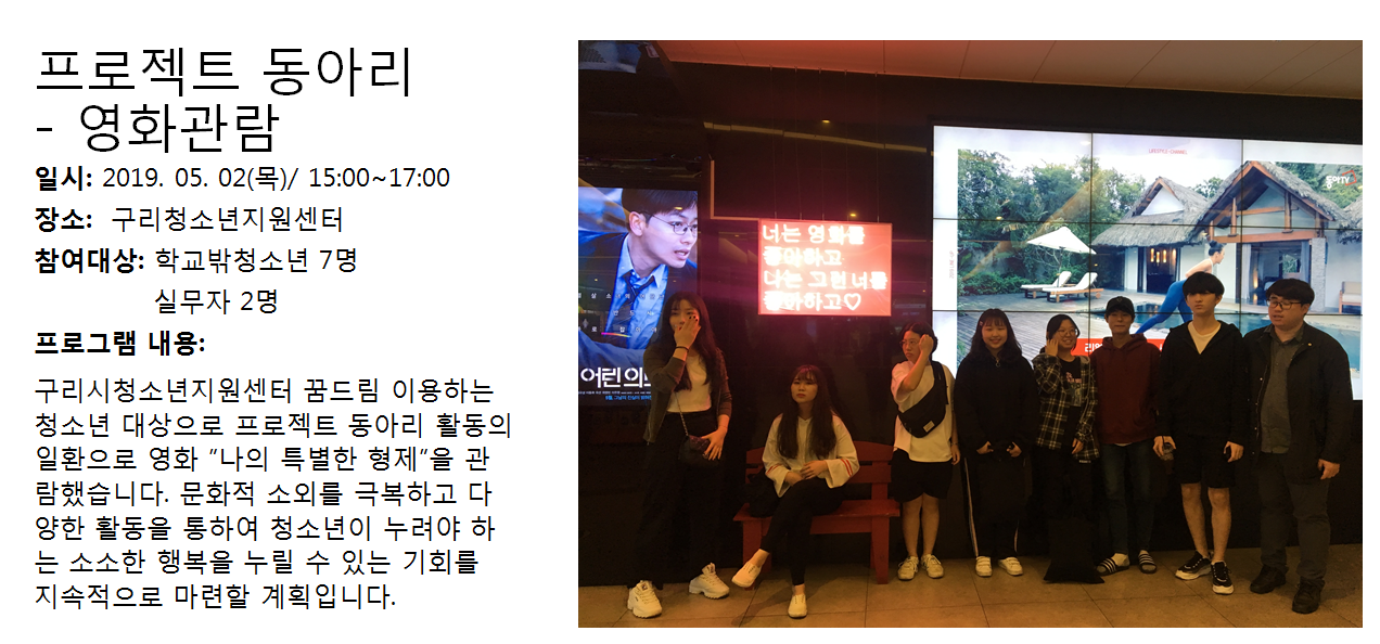 청소년상담복지센터 2019년 5월 프로젝트동아리 - 영화관람 작성자 관리자 등록일자 2019년 6월 4일 14시 9분 14초 조회 315 1559624954_photo_table.png [ Size : 861.06KB , Down : 127 ] 미리보기 다운로드 목록보기
