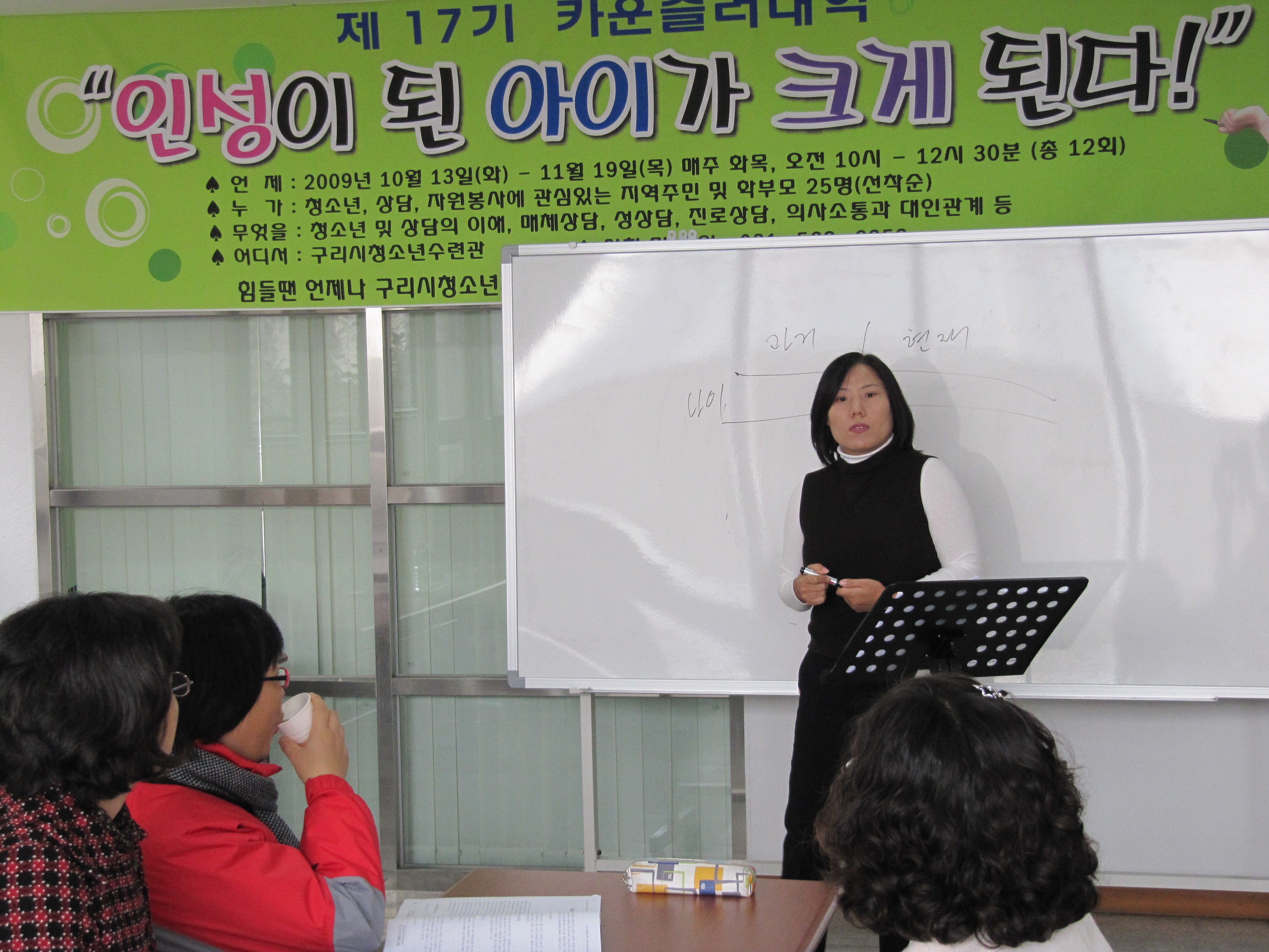 청소년상담복지센터 17기 카운슬러 대학 작성자 관리자 등록일자 2010년 1월 13일 19시 41분 57초 조회 729 제 17기 카운슬러 대학이 열렸습니다. 여러 기관의 전문가 선생님들이 좋은 강의를 해 주셨습니다. 상담전문가, 놀이치료전문가, 신경정신과 전문의 등 다양한 전문적인 분야에 대해 배울 수 있었습니다. 많은 분들이 끝까지 수료하셔서, 성인자원봉사자로서의 길을 함께 하시고자 합니다~ 1263379412_photo_table.jpg [ Size : 2.9MB , Down : 127 ] 미리보기 다운로드 목록보기