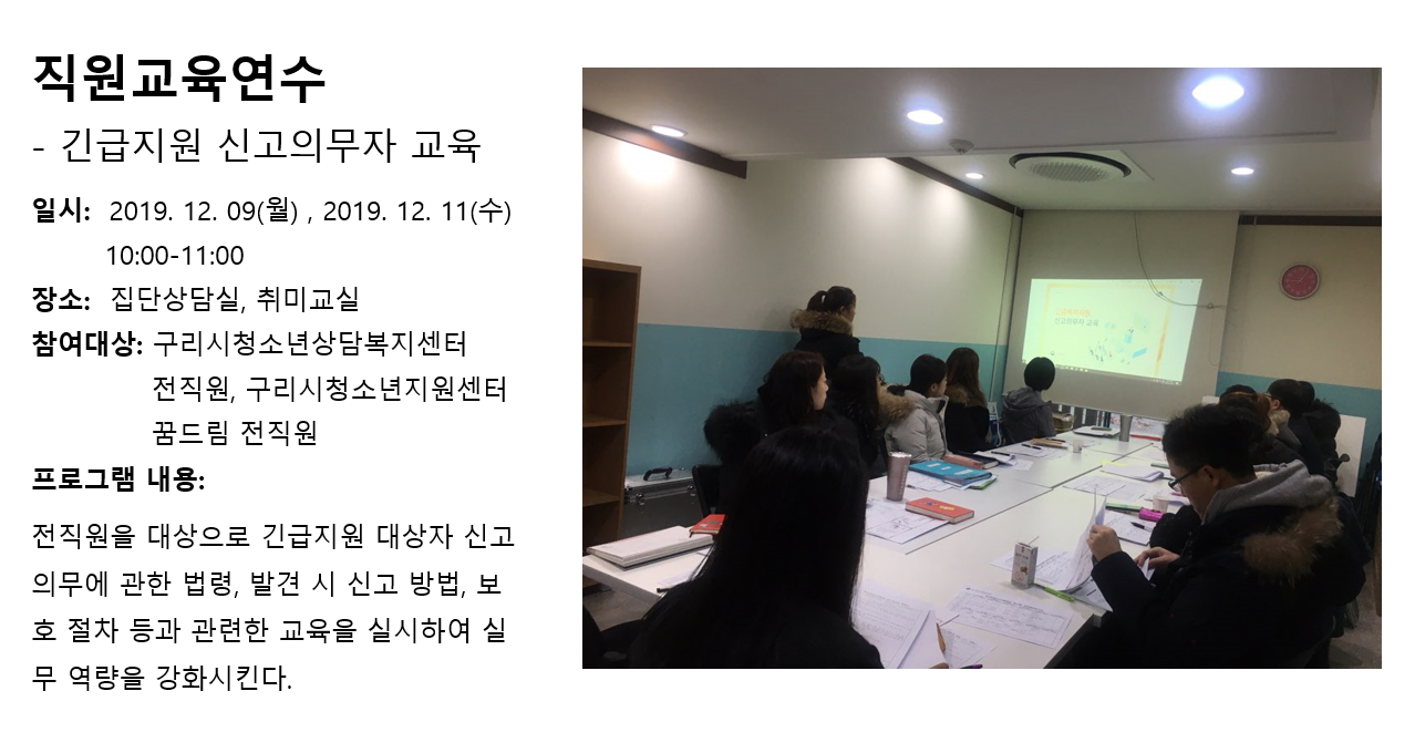 청소년상담복지센터 2019년 12월 직원교육연수 - 긴급지원 신고의무자 교육 작성자 관리자 등록일자 2020년 1월 6일 14시 32분 42초 조회 351 1578288762_photo_table.png [ Size : 623.45KB , Down : 112 ] 미리보기 다운로드 목록보기