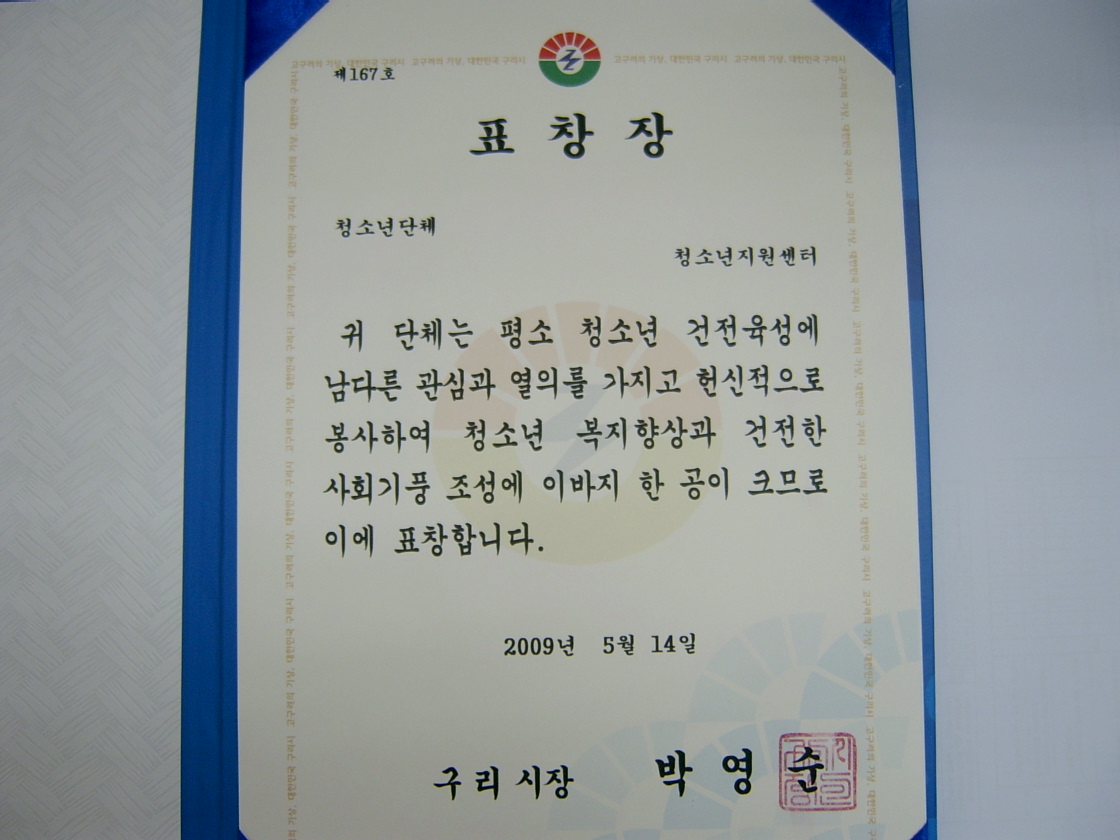 2009년 모범청소년 및 청소년단체 시상식에서 구리시청소년지원센터가 청소년단체상을