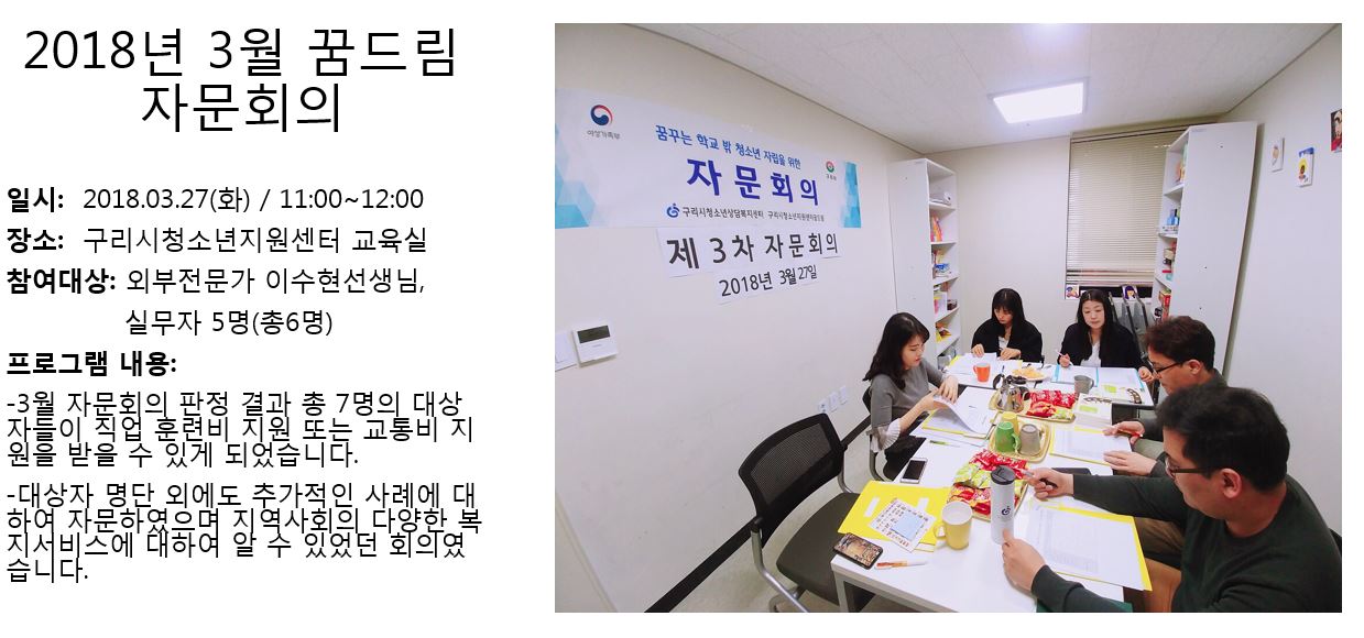 청소년상담복지센터 2018년 3월 꿈드림 자문회의 작성자 관리자 등록일자 2018년 4월 2일 14시 55분 45초 조회 323 1522648545_photo_table.jpg [ Size : 121.22KB , Down : 108 ] 미리보기 다운로드 목록보기