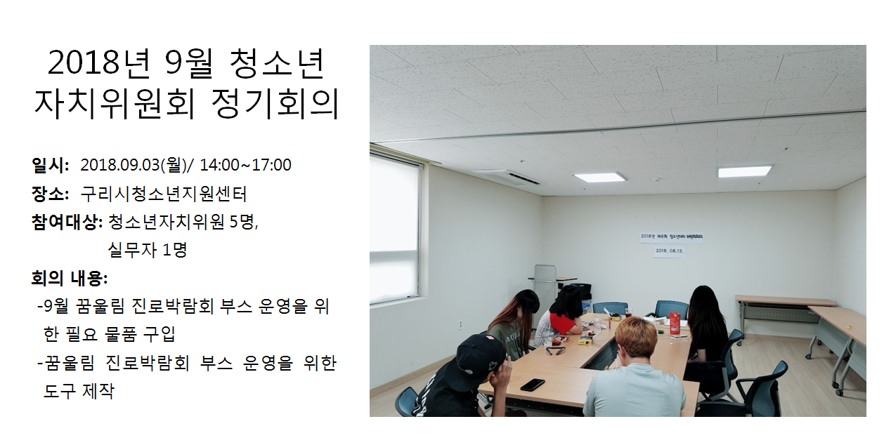 청소년상담복지센터 2018년 9월 청소년자치위원회 정기회의 작성자 관리자 등록일자 2018년 10월 4일 18시 56분 43초 조회 340 1538647003_photo_table.png [ Size : 551.85KB , Down : 98 ] 미리보기 다운로드 목록보기
