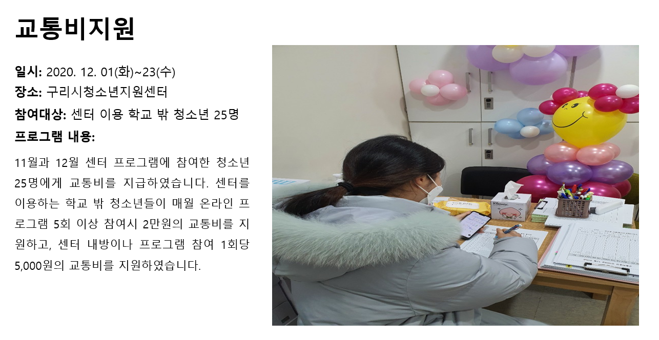 청소년상담복지센터 2020년 12월 교통비지원 작성자 관리자 등록일자 2021년 1월 7일 9시 26분 56초 조회 316 1609979216_photo_table.png [ Size : 730.12KB , Down : 130 ] 미리보기 다운로드 목록보기