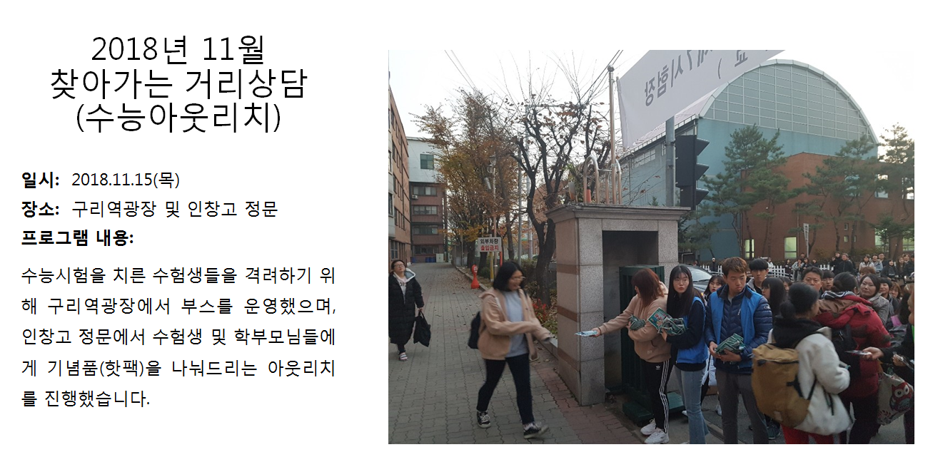 청소년상담복지센터 2018년 11월 찾아가는거리상담 수능아웃리치 작성자 관리자 등록일자 2018년 12월 7일 13시 11분 56초 조회 370 1544155916_photo_table.png [ Size : 886.2KB , Down : 111 ] 미리보기 다운로드 목록보기