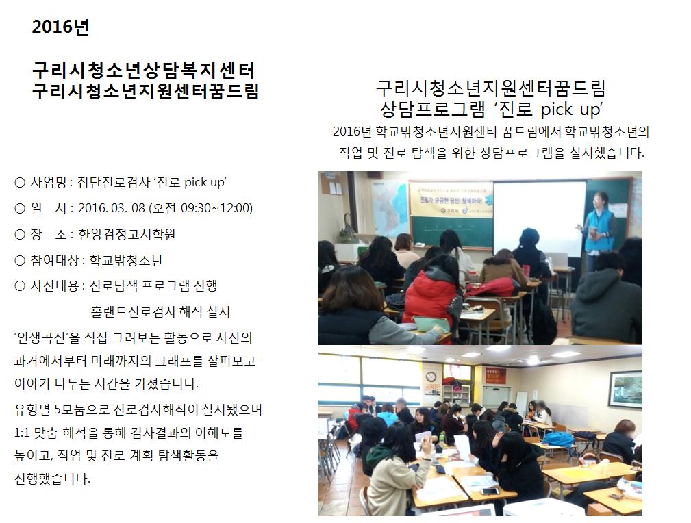 청소년상담복지센터 [꿈드림] 집단진로검사 진로'Pick up' 작성자 관리자 등록일자 2016년 3월 8일 16시 39분 28초 조회 448 1457422768_photo_table.jpg [ Size : 133.77KB , Down : 88 ] 미리보기 다운로드 목록보기