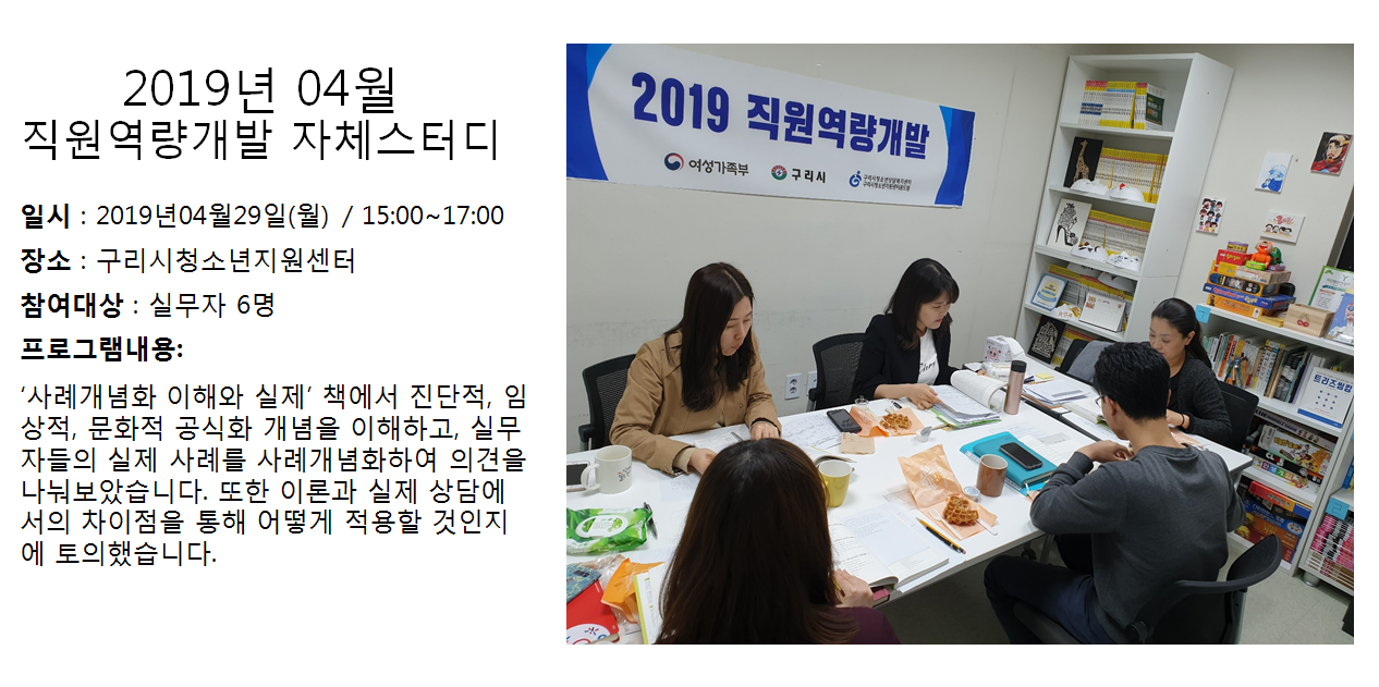 청소년상담복지센터 2019년 4월 직원역량개발 자체스터디 작성자 관리자 등록일자 2019년 5월 2일 13시 44분 12초 조회 283 1556772252_photo_table.png [ Size : 763.59KB , Down : 124 ] 미리보기 다운로드 목록보기