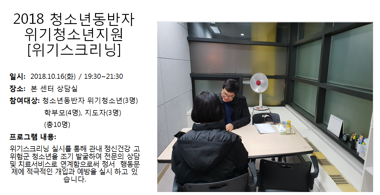 청소년상담복지센터 2018년 10월 청소년동반자 위기청소년지원-위기스크리닝 작성자 관리자 등록일자 2018년 11월 5일 10시 24분 20초 조회 381 1541381060_photo_table.png [ Size : 751.07KB , Down : 106 ] 미리보기 다운로드 목록보기