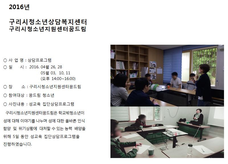 청소년상담복지센터 [꿈드림] 성교육 집단상담프로그램 작성자 관리자 등록일자 2016년 5월 19일 14시 59분 57초 조회 466 1463637597_photo_table.jpg [ Size : 77.63KB , Down : 103 ] 미리보기 다운로드 목록보기
