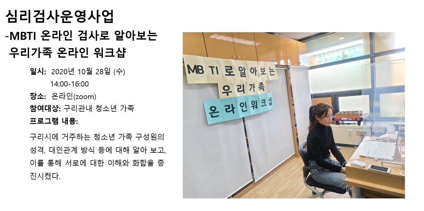청소년상담복지센터 2020년 10월 심리검사운영사업 - MBTI 온라인 검사 작성자 관리자 등록일자 2020년 11월 4일 11시 3분 36초 조회 456 1604455416_photo_table.png [ Size : 807.21KB , Down : 162 ] 미리보기 다운로드 목록보기