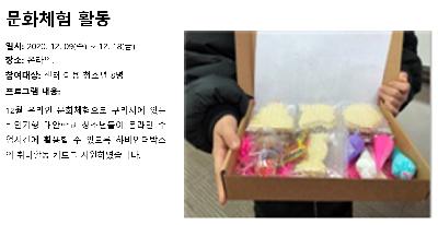 게시판 검색 표시줄수 : 3개씩 보기6개씩 보기9개씩 보기12개씩 보기15개씩 보기18개씩 보기21개씩 보기24개씩 보기27개씩 보기30개씩 보기 검색 대상 : 전체 검색제목내용 검색어 : 검색 총 2,970건(124/330페이지) 2020년 12월 교통비지원 2021-01-07 2020년 12월 급식지원 2021-01-07 2020년 12월 찾아가는거리상담 2021-01-07 2020년 12월 문화체험활동 2021-01-07 2020년 12월 직업체험 2021-01-07 2020년 12월 스토리푸드동아리 2021-01-07 2020년 12월 학습멘토링 2021-01-07 2020년 12월 자립준비클래스 2021-01-07 2020년 12월 구리렐레 동아리 2021-01-07 ◀ 이전 121 122 123 124 125 126 127 128 129 130 다음 ▶
