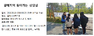게시판 검색 표시줄수 : 3개씩 보기6개씩 보기9개씩 보기12개씩 보기15개씩 보기18개씩 보기21개씩 보기24개씩 보기27개씩 보기30개씩 보기 검색 대상 : 전체 검색제목내용 검색어 : 검색 총 2,970건(159/330페이지) 2019년 7월 프로젝트동아리 - 뮤지컬 관람(빨래) 2019-08-01 2019년 7월 체험학습 - 스포츠몬스터 2019-08-01 2019년 6월 내부사례회의 2019-07-05 2019년 6월 외부사례회의 2019-07-05 2019년 6월 학교폭력예방사업운영 친친톡프로그램 (동인초) 2019-07-05 2019년 6월 학교폭력예방교육 친친톡 평가회 (나눔터모임) 2019-07-05 2019년 6월 갈매지역 찾아가는상담실 2019-07-05 2019년 6월 찾아가는거리상담 (토평중) 2019-07-05 2019년 6월 찾아가는거리상담 (갈매고) 2019-07-05 ◀ 이전 151 152 153 154 155 156 157 158 159 160 다음 ▶