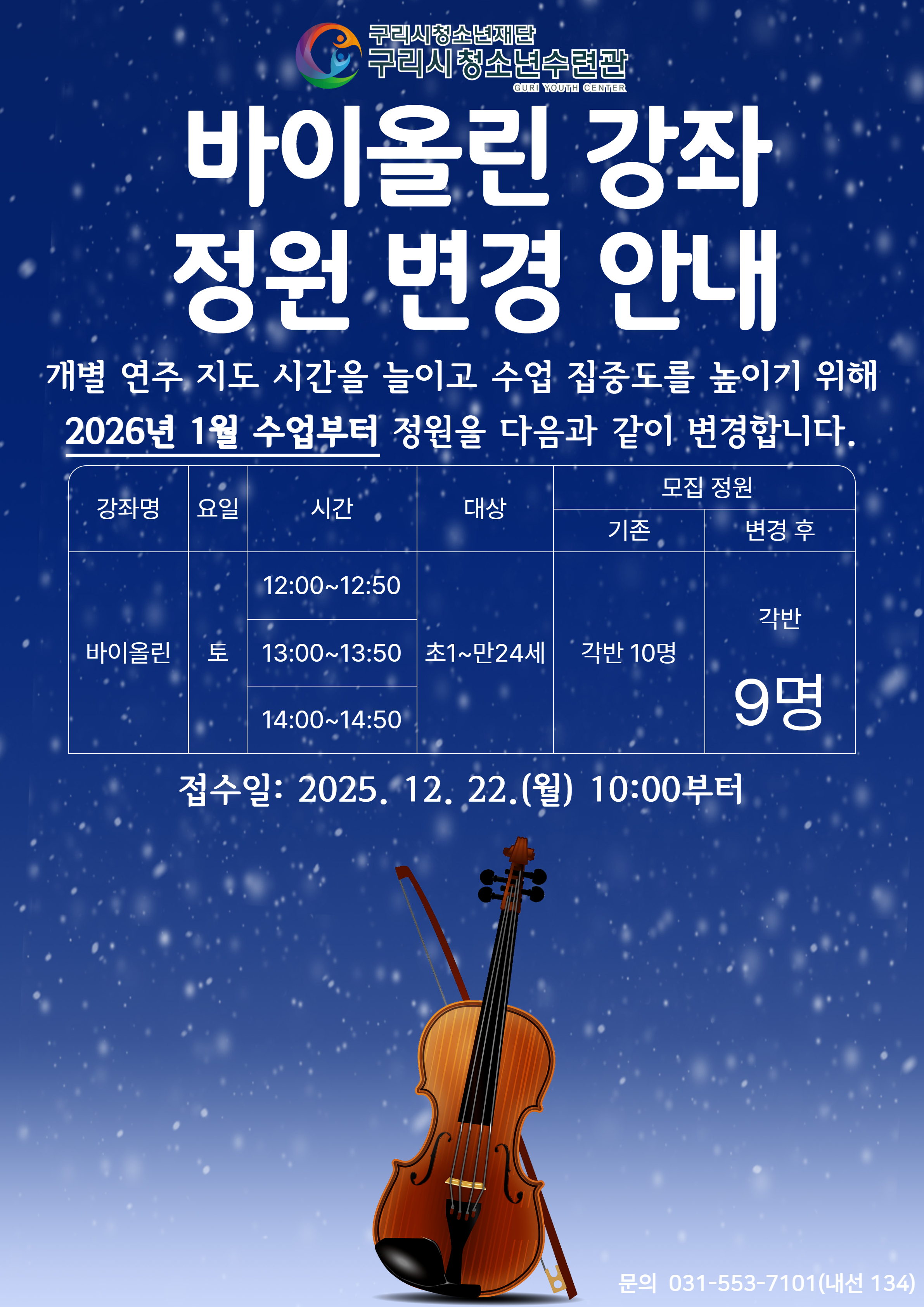 공지 청소년수련관 청소년수련관 바이올린 강좌 수업정원 변경 안내 작성자 문서정 등록일자 2025년 12월 8일 10시 44분 37초 조회 74 바이올린 정원 변경.jpg [ Size : 3.06MB , Down : 64 ] 미리보기 다운로드 목록보기
