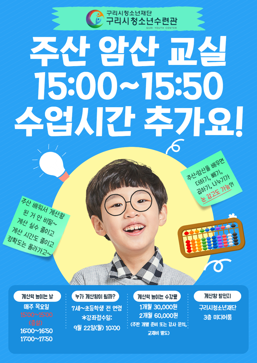 청소년수련관 주산 암산 교실 | 목 | 15:00~15:50 (증설) | 7세~초6 | 각반 12명 | 3층 미디어룸 | 1개월 30,000원 2개월 60,000원 | 교재비 별도 |