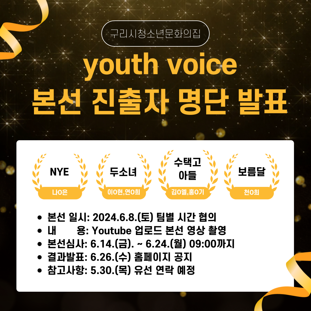 청소년문화의집 [발표]청소년문화공간 'Youth Voice' 온라인 노래 경연 본선 진출자 발표 작성자 김진수 등록일자 2024년 5월 29일 17시 37분 31초 조회 418 제목을-입력해주세요_-001 (5).png [ Size : 752.09KB , Down : 255 ] 미리보기 다운로드 목록보기
